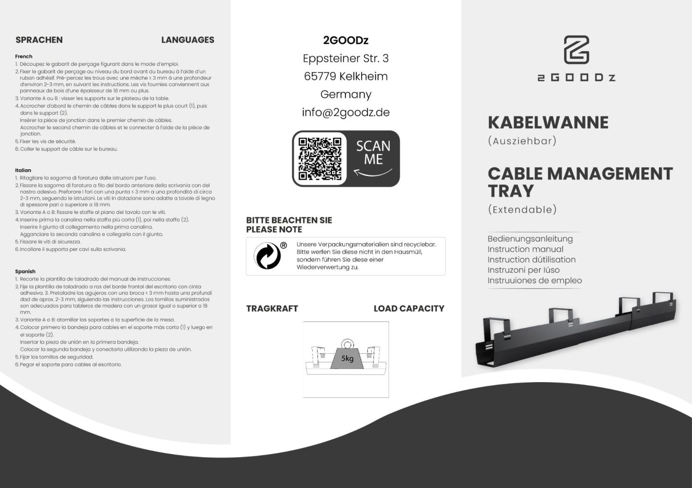 Die maximale Traglast von 5kg darf nicht überschritten werden. Eine Überlastung kann zu Verformungen des Kanals und zu Beschädigungen an Kabeln oder Verletzungen führen.